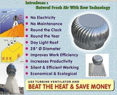 We are one of the well-accredited manufacturers and traders of a quality-sorted range of Turbo Roof Ventilator. Our products are sturdily constructed with perfection in order to attain clients satisfactions and trusts. The entire gamut of these products is thoroughly tested and checked on the specified parameters in order to gauge the defect-free nature.